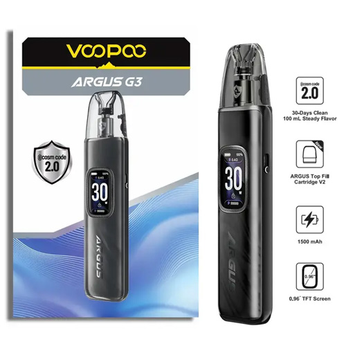 Voopoo Argus G3 Pod Kit 30W is a next generation pod system for exceptional performance flavor accuracy and long lasting durability. Feature iCOSM CODE 2.0 technology a powerful 1500mAh battery and a sleek Zinc Alloy + PC body this device. With adjustable wattage up to 30W, dual top-fill cartridges (0.4Ω & 0.7Ω) and compatibility with Freebase and Nicotine Salt e-liquids. The Argus G3 deliver a clean, smooth, and highly customizable vaping experience.